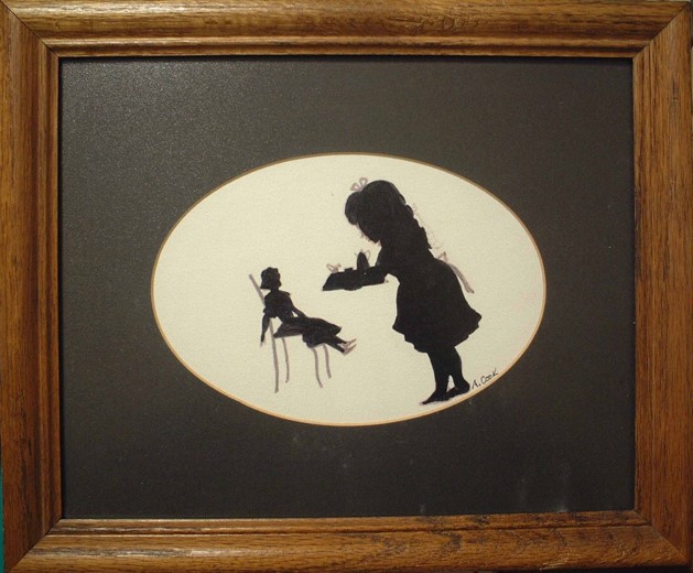 私がロサンゼルス逗留から帰国時にいただいた患者さん(米国人女性)の作品です。女の子が人形にコーヒーポットを運ぶ飯事(ままごと)の絵です。椅子に座る人形は小さく描かれているが大人の女性。大きく描かれている幼い女の子に患者さんの「働きたい」という思いが投影されているのでしょう。また患者さんの既存の観念にとらわれない絵画の着想を知ることができます。