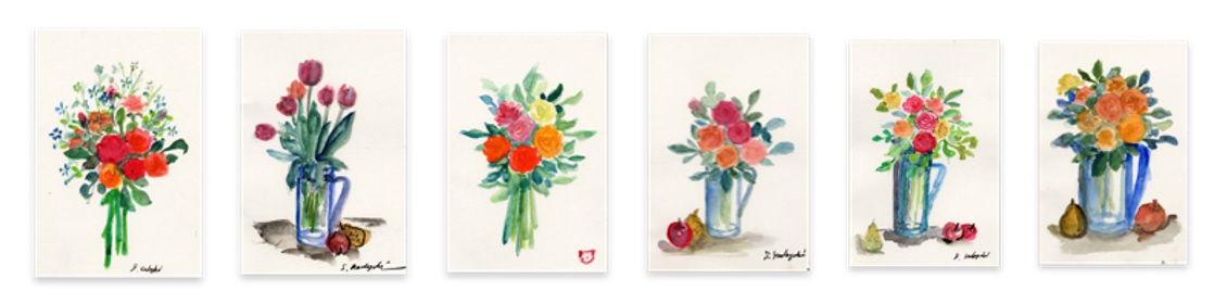 入院しておられた患者さん(女性)からお借りした色彩豊かな絵葉書です。ベッドサイドで、絵の具と筆で1枚1枚描かれておられた姿に敬服します。